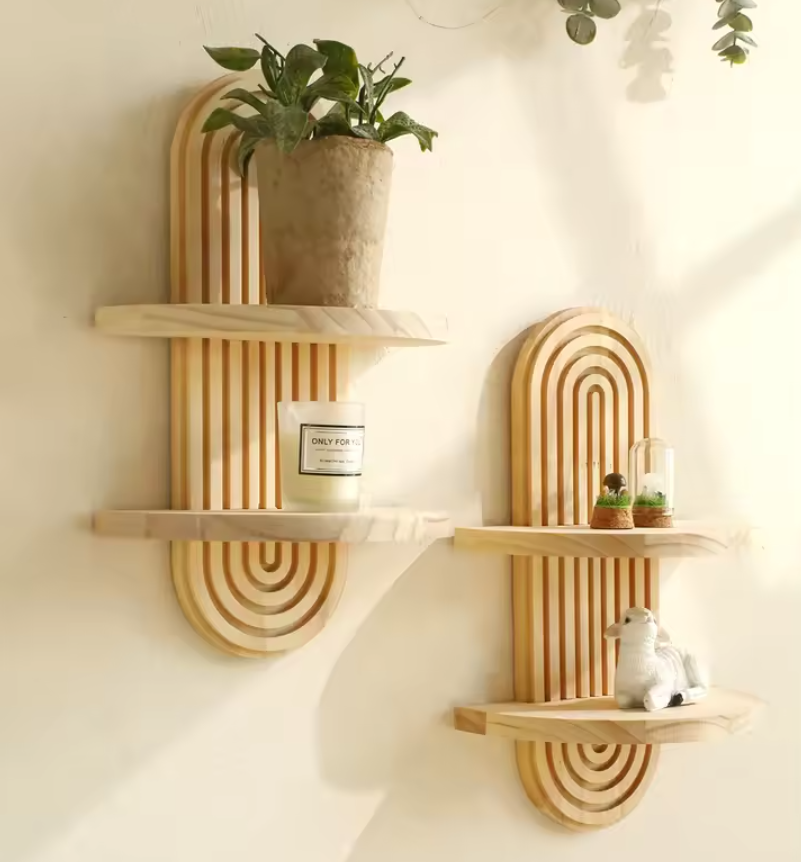 Apportez une touche chaleureuse et tendance à votre intérieur avec ces étagères murales géométriques de style bohème. À la fois décoratives et fonctionnelles, elles offrent une solution de rangement élégante tout en libérant l’espace au sol 🏡.